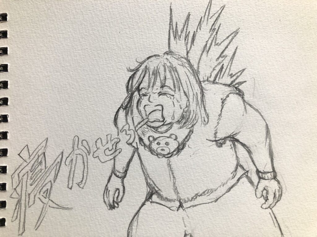 というわけで、今日はゴジラ-1.0の筋肉質ゴジラを描きたいなと思って、夜泣きする幼児とMIXさせてみました。